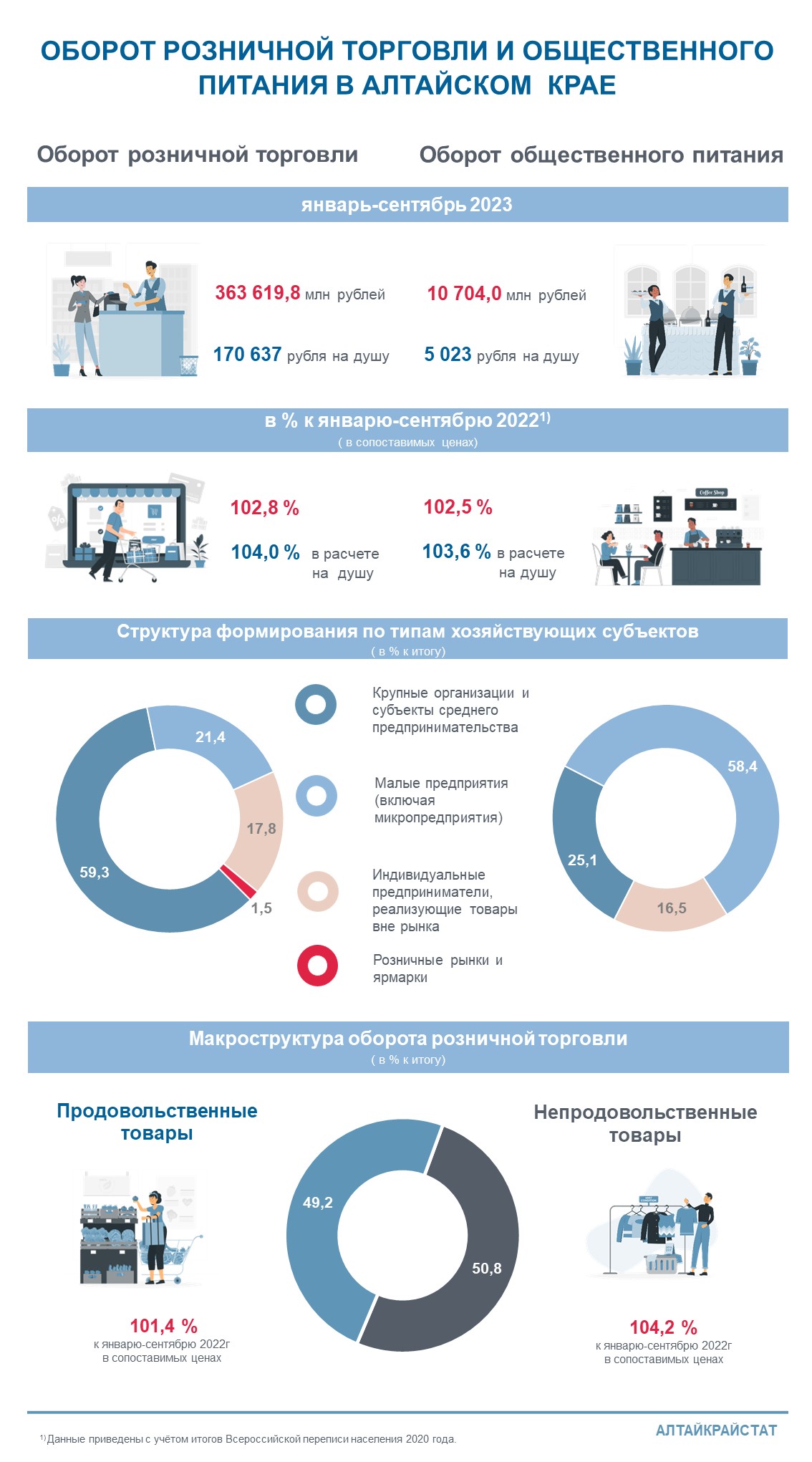 Оборот розничной торговли Алтайского края в январе-сентябре 2023 года составил 363,6 млрд рублей или 102,8% (в сопоставимых ценах) к январю-сентябрю 2022 года, оборот общественного питания – 10,7 млрд рублей, или 102,5%.