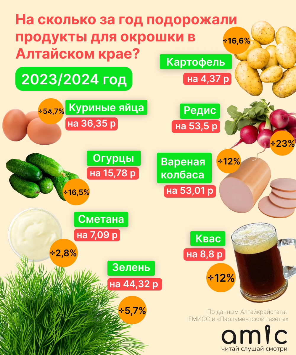 P.S. За основу мы взяли средние цены, которые отслеживает Алтайкрайстат, за июнь 2023-го и июнь 2024 года . Но краевое ведомство мониторит далеко не все продукты. Данные по некоторым позициям мы позаимствовали из федеральной базы ЕМИСС . Но и там оказалось не все, что нужно в окрошку. Поэтому недостающую часть мы подсмотрели у "Парламентской газеты" , которая провела свой анализ.