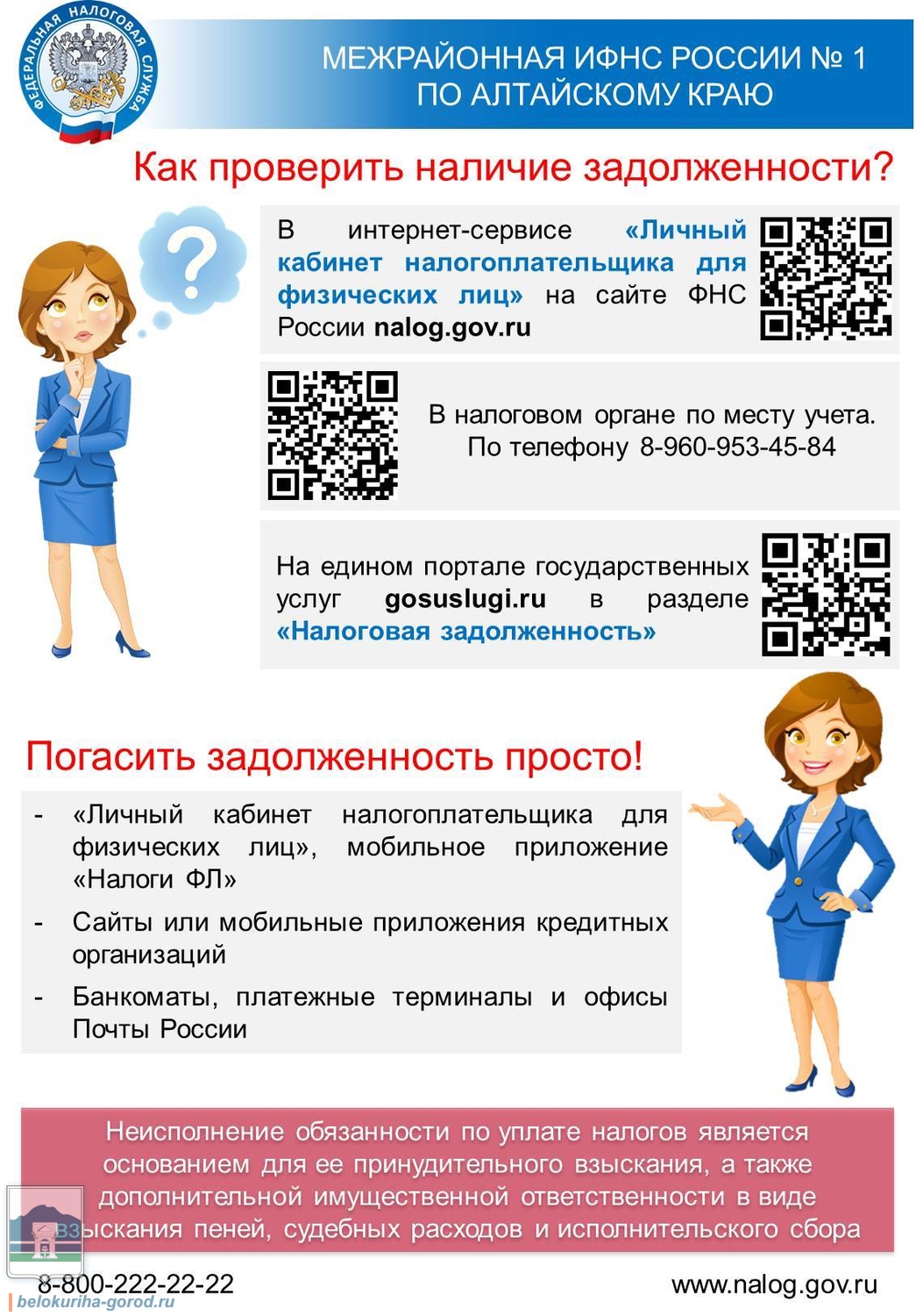 Проверить информацию о наличии либо отсутствии налоговой задолженности и получить квитанции на ее уплату можно на официальном сайте ФНС России (www.nalog.gov.ru), воспользовавшись сервисом «Личный кабинет налогоплательщика для физических лиц», на портале государственных и муниципальных услуг (www.gosuslugi.ru), при обращении в операционный зал Инспекции, а также, по телефону 8 (960) 953-45-84.