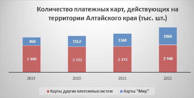 По состоянию на 1 октября 2022 года в крае выдано 4,8 млн платежных карт различных платежных систем, что на 16% (на 661 тысячу штук) больше, чем в аналогичном периоде 2021 года. В среднем на 1 жителя Алтайского края приходится около 2 карт различных платежных систем.