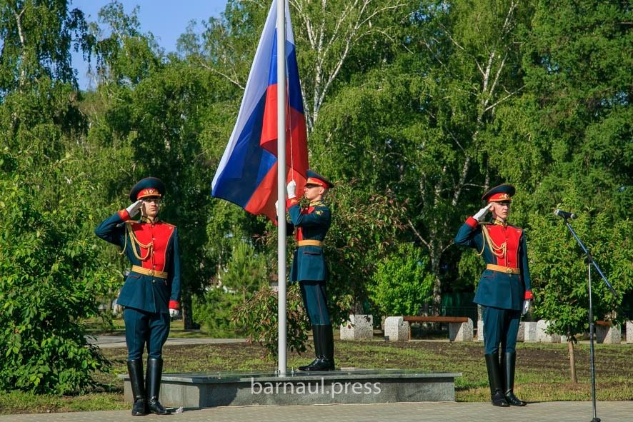 Поднятие государственного флага Российской Федерации прошло в Нагорном парке. Под звуки гимна курсанты Барнаульского юридического института подняли у стелы "Город трудовой доблести" российский триколор.