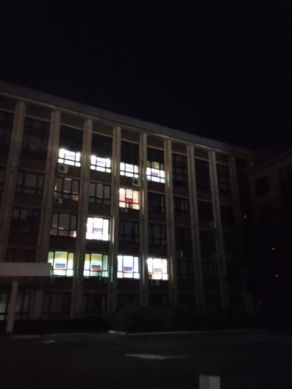 Акция началась в 23 часа. В зданиях учебных учреждений зажгли свет так, чтобы из освещенных окон на фасадах получились буквы «Z» и «V».