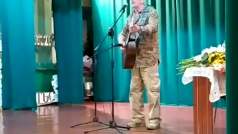 В камуфляжной рубашке в местном ДК артист общался со зрителями пел песни