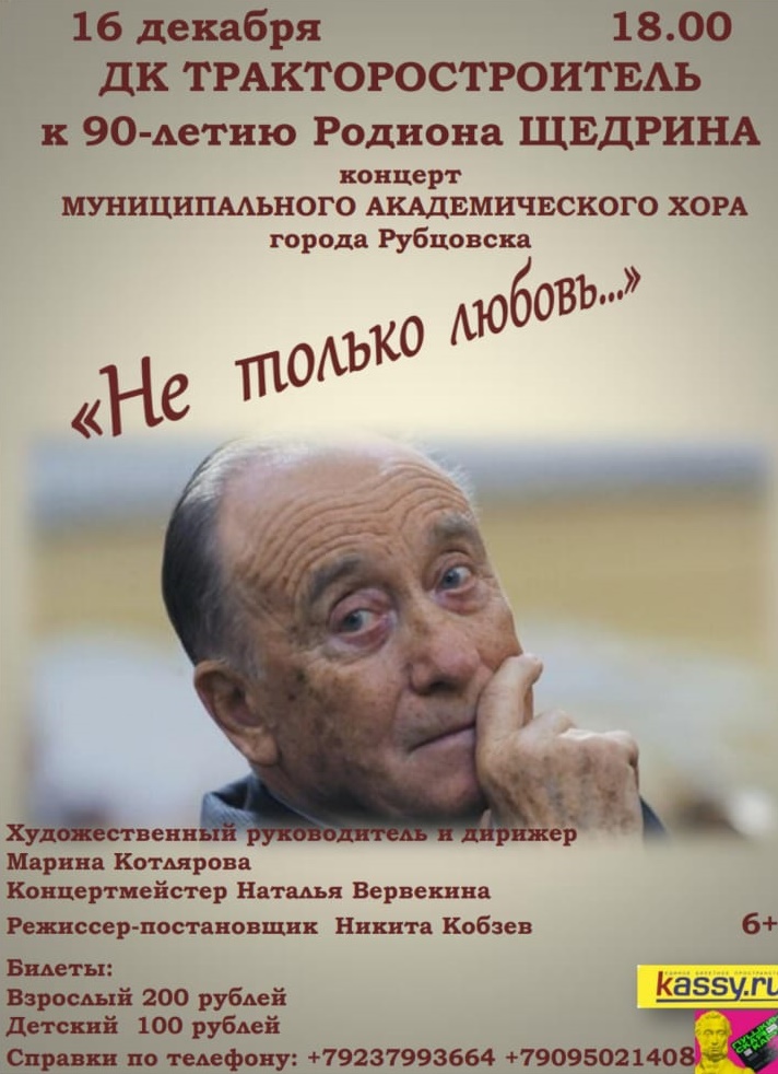 16 декабря, в 18.00, в ДК «Тракторостроитель» состоится концерт муниципального академического хора города Рубцовска, к 90-летию Родиона Щедрина «Не только любовь…». Приходите, будет интересно!