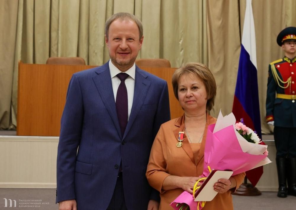 Медалью «За заслуги перед обществом» была награждена Татьяна Александровна Боровцова, заведующая сектором «Традиционная русская культура» научно-исследовательского отдела Государственного художественного музея Алтайского края.