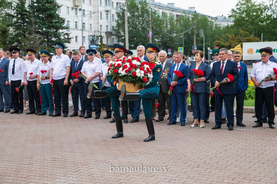 Отдать дань уважения мужеству и героизму советского народа, защищавшего страну, пришли заместитель Председателя Правительства Алтайского края Виталий Снесарь, глава Барнаула Вячеслав Франк, председатель Барнаульской городской Думы Галина Буевич, главный федеральный инспектор по Алтайскому краю аппарата Полномочного представителя Президента РФ в СФО Юрий Земский, ветераны, руководители силовых структур, региональных и муниципальных органов власти, администрации города, депутаты АКЗС и Барнаульской городской Думы, народные дружинники, бойцы юнармейского отряда, представители ветеранских организаций,волонтеры, жители и гости города.