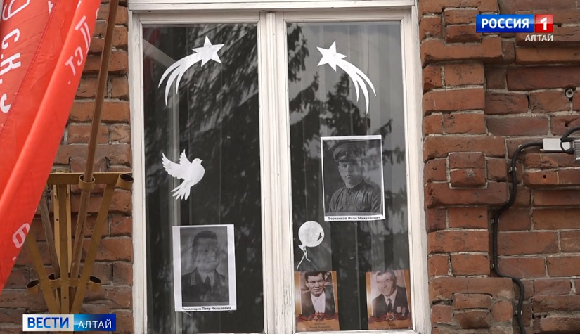 В Бийском драматическом театре окна оформили Георгиевской лентой и снимками родственников актёров – солдат Великой Отечественной войны.