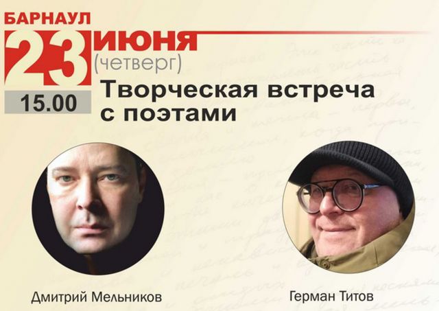 23 июня, в ходе Литературного фестиваля Роберта Рождественского, в Алтайской краевой библиотеке им. В. Я. Шишкова пройдет встреча с замечательными во всех смыслах поэтами. С публикой будут рады увидеться Герман Титов (Сумы – Санкт-Петербург) и Дмитрий Мельников (Ташкент – Москва).