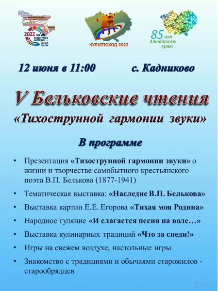 В рамках Года культурного наследия народов России в Алтайском крае, марафона культурных событий в муниципальных образованиях Алтайского края «Культпоход», к 145 летию со дня рождения самобытного крестьянского поэта В.П. Белькова, 12 июня 2022 года в 11-00 часов в с. Кадниково Мамонтовского района Алтайского края пройдут V юбилейные Бельковские чтения.