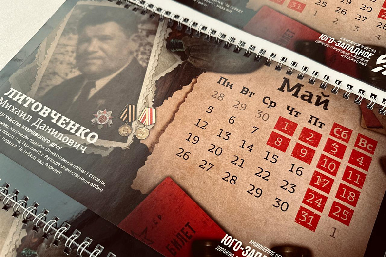 В преддверии 80-й годовщины Победы в Великой Отечественной войне дорожные предприятия нашего региона активно готовят памятные мероприятия. Одним из таких мероприятий стало создание уникального календаря специалистами Юго-Западного ДСУ. Этот календарь посвящён двум важным датам: 80-летию Победы и 70-летию самого предприятия.