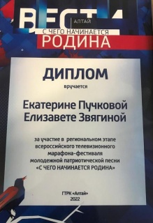 Диплом за участие в Марафоне Дуэт воспитанниц студии "НоТА" Елизаветы Звягиной и Екатерины Пучковой хорошо известен не только рубцовчанам, но и всем, кто следит за развитием музыкальной культуры Алтайского края. Клип "За тебя, Родина-мать" дуэта "НоТы" вошел в тройку лучших клипов Марафона молодёжной патриотической песни «С чего начинается Родина». https://vesti22.tv/news/smotrite-kto-vystupil-ot-altayskogo-kraya-vo-vse...