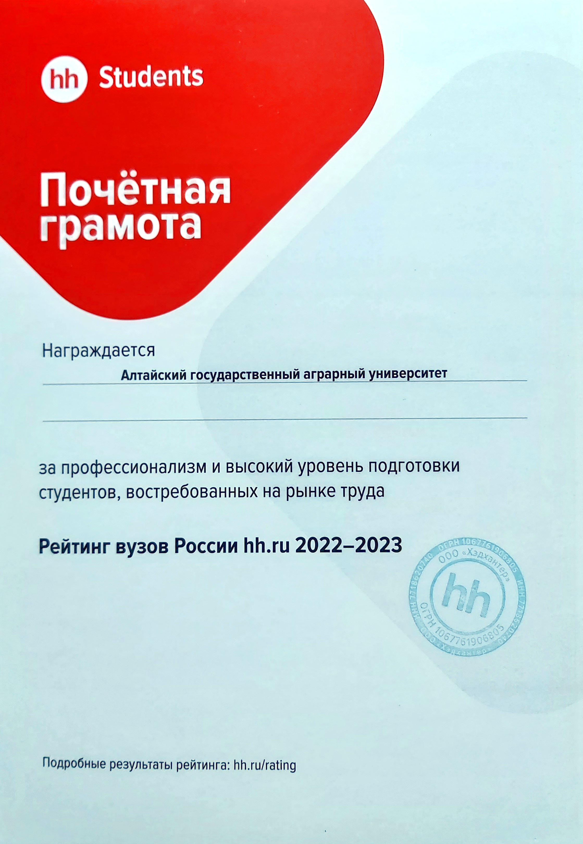 Алтайский ГАУ отмечен почетной грамотой компании «Head Hunter» и специальной информационной табличкой лидера рейтинга «Здесь учатся будущие профессионалы» . Как гласит текст почетной грамоты, АГАУ отмечен «за профессионализм и высокий уровень подготовки студентов, востребованных на рынке труда».