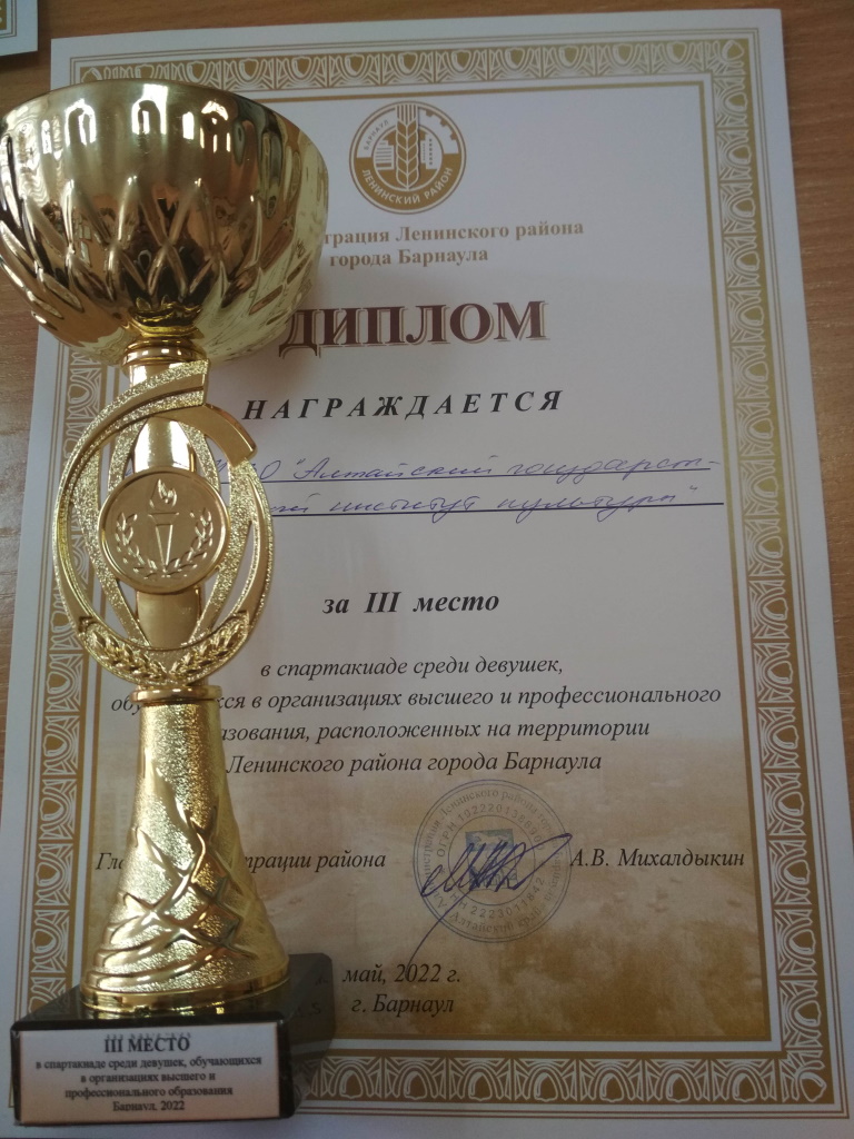 30 мая в администрации Ленинского района прошло награждение комплексной Спартакиады. АГИК занял 3 место среди девушек, обучающихся в организациях высшего и профессионального образования, расположенных на территории Ленинского района города Барнаула.