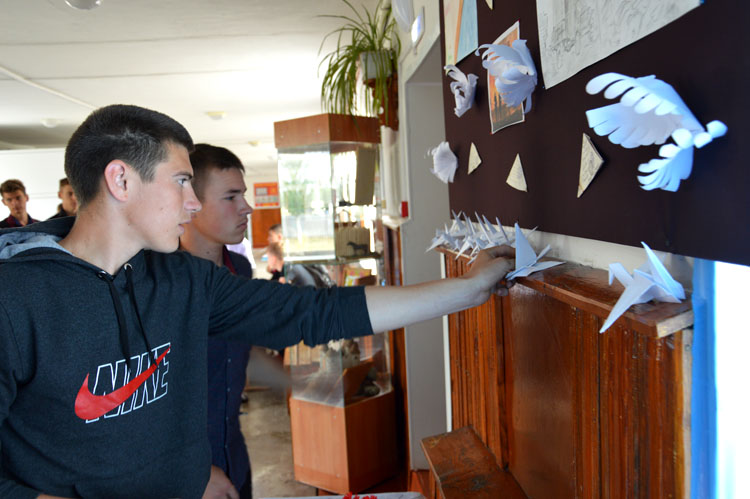 «Накануне памятной даты мы с обучающимися оформили тематическую выставку рисунков. Совместно с социальным педагогом Татьяной Ивановной Планиной ребята изготовили корзину с цветами для возложения к мемориалу Славы, с преподавателем истории Надеждой Владимировной Савиной – изготовили в технике оригами из бумаги белых журавликов», – рассказала о подготовке к мероприятию педагог-организатор В.А.Долбышева.