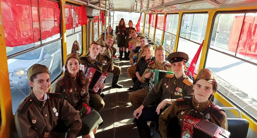 В трамвае будут «Ехать домой с Победой» активисты школьного музея в солдатской форме, под гармонь исполнять песни военных лет.