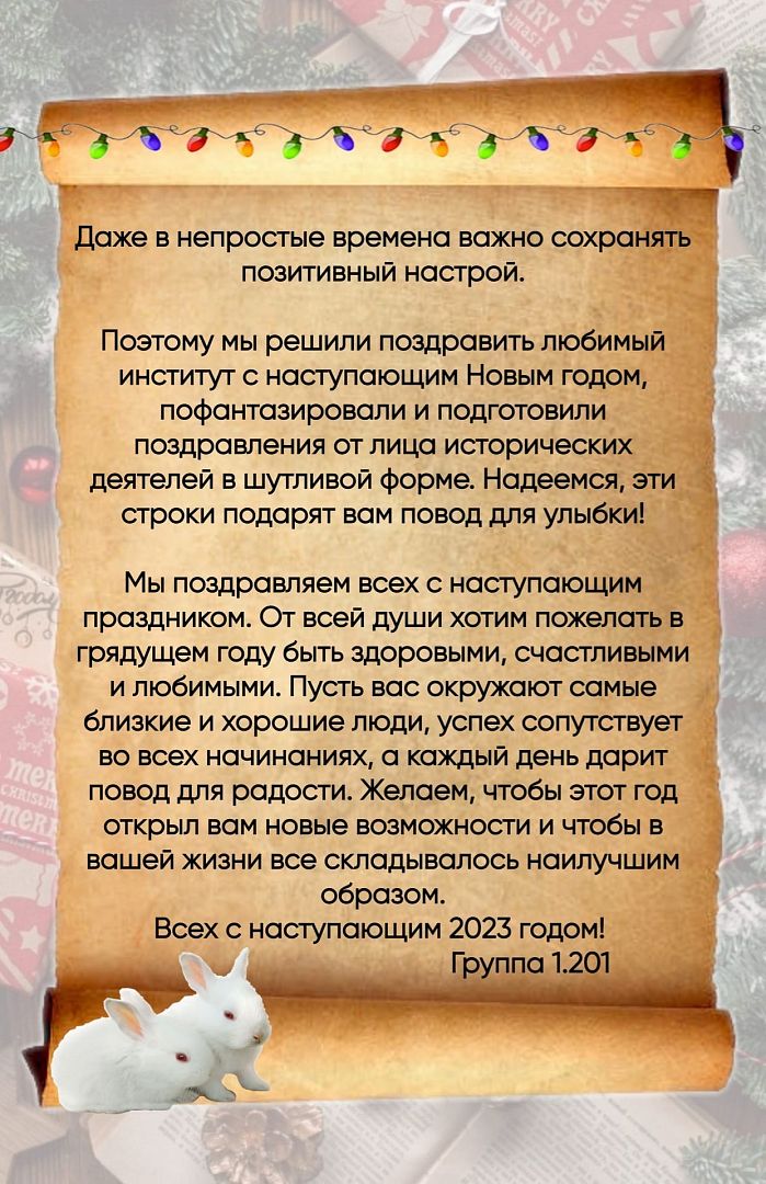 Первокурсники ИИМО решили пофантазировать на исторические темы и подготовили поздравления с наступающим Новым годом от лица известных исторических персонажей: Владимира Мономаха, Александра Невского, Ивана Грозного, Петра I, Акинфия Демидова, Владимира Маяковского, Фиделя Кастро. Ребята, опираясь на знание исторических фактов, а также биографий попытались воспроизвести стили речи выбранных деятелей.