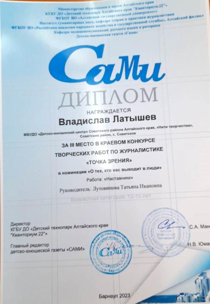Обучающийся детско-юношеского центра Советского района Владислав Латышев стал одним из победителей краевого конкурса, заняв третье место в специальной номинации, посвящённой Году педагога и наставника, «О тех, кто нас выводит в люди» (руководитель Лутовинова Т.И.).