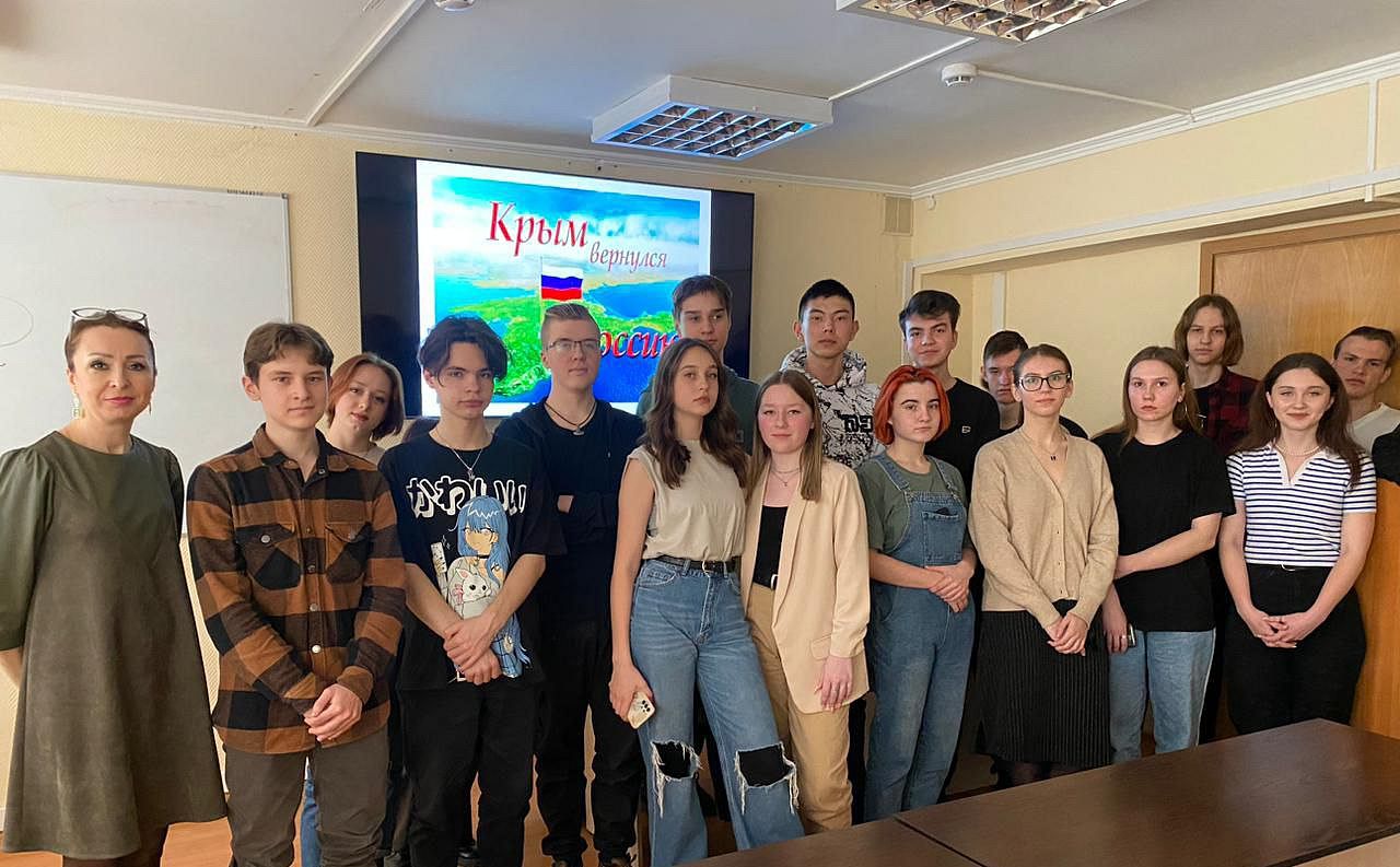 Ребята из Клуба любителей истории Отечества накануне праздника провели Час исторической памяти «История одного полуострова». Участники мероприятия говорили об истории Крыма от момента его заселения людьми до современности. Прозвучали доклады о русско-турецких войнах, в результате которых Крым стал частью Российской империи. Студенты вспомнили трагические страницы – 349 дней обороны Севастополя в Крымской войне, битву за Крым и оборону Севастополя в ходе Великой Отечественной войны, события 2014 года.