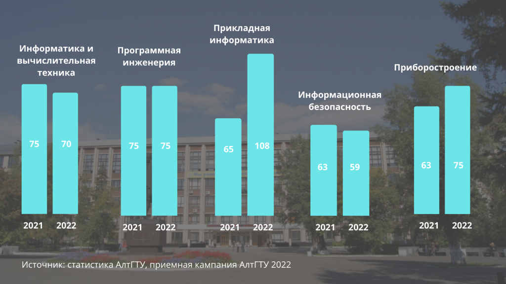 На сегодня, одними из наиболее популярных и востребованных профессий являются профессии в сфере Информационных технологий. Минцифры Алтайского края приглашает выпускников на ИТ-специальности. С 2022 года количество бюджетных мест по отдельным специальностям ИТ увеличилось. Ниже приведена статистика ведущих университетов Алтайского края: