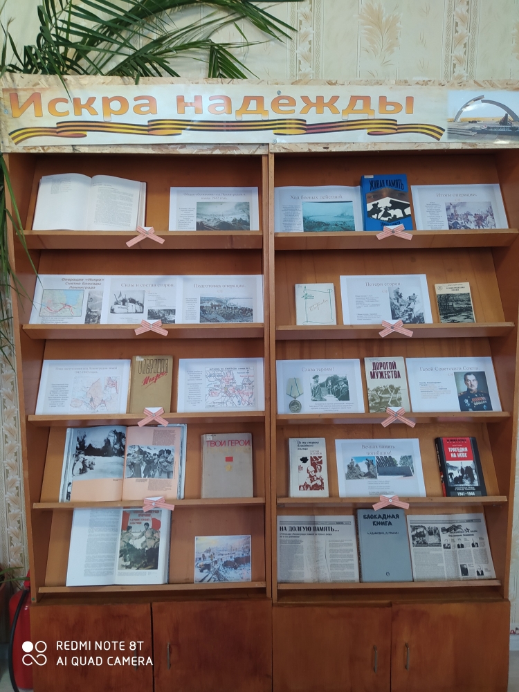 Свой рассказ мы начали с анализа обстановки под Ленинградом, которая сложилась еще в 1941 году и повлияла на весь дальнейший ход битвы за город. Ведь операция «Искра» – это была пятая по счету попытка прорыва блокады. Экспозиция посвящена обороне города, на выставке представлена литература о родах войск и судьбах солдат, участвовавших в прорыве блокады, книги о знаменитой «Дороге жизни», воспоминаниях ленинградцев, оказавшихся в блокадном кольце. Книга Хассо Г.Стахов «Трагедия на Неве», Кузнецов В.А.; Иванов А.Т. «Дорогой мужества», Буров А.В. « Твои герои Ленинград», « Великая Отечественная Война» 1941-1945-хроника событий и др. Также на выставке можно будет познакомиться с художественной литературой, посвященной этому историческому событию: А. Адамович, Д. Гранин «Блокадная книга», О. Бергольц «Повести Ленинградских писателей», « Ленинградская поэма». Выставку сопровождают фотографии, иллюстрации, отражающие исторические события блокадного города Ленинграда и операции «Искра», книга С.М. Бойцова, С.Н. Борщева «Операция Искра».