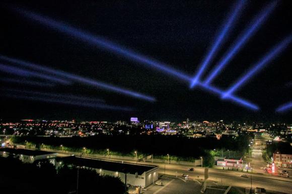 В 23:30 16 световых установок на склоне Нагорного парка подсветят ночное небо города прожекторами - в знак памяти обо всех, кто отдал свои жизни в борьбе за Победу.