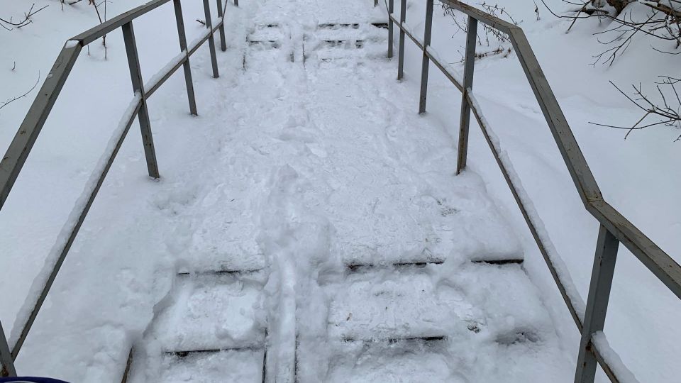 На кадрах видно, что путь по лестнице протоптан пешеходами. При этом пандус для проезда колясок заметен.