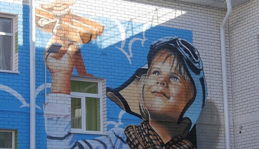 После этого памятного визита садик назвали в честь пилотажной группы и, чтобы соответствовать, решили украсить фасад. Не смогли обойтись и без детских впечатлений. Воспитанников привлекли к созданию эскизов – устроили конкурс рисунков. На основе трёх лучших работ аэрограф Николай Замятин придумал своё граффити.