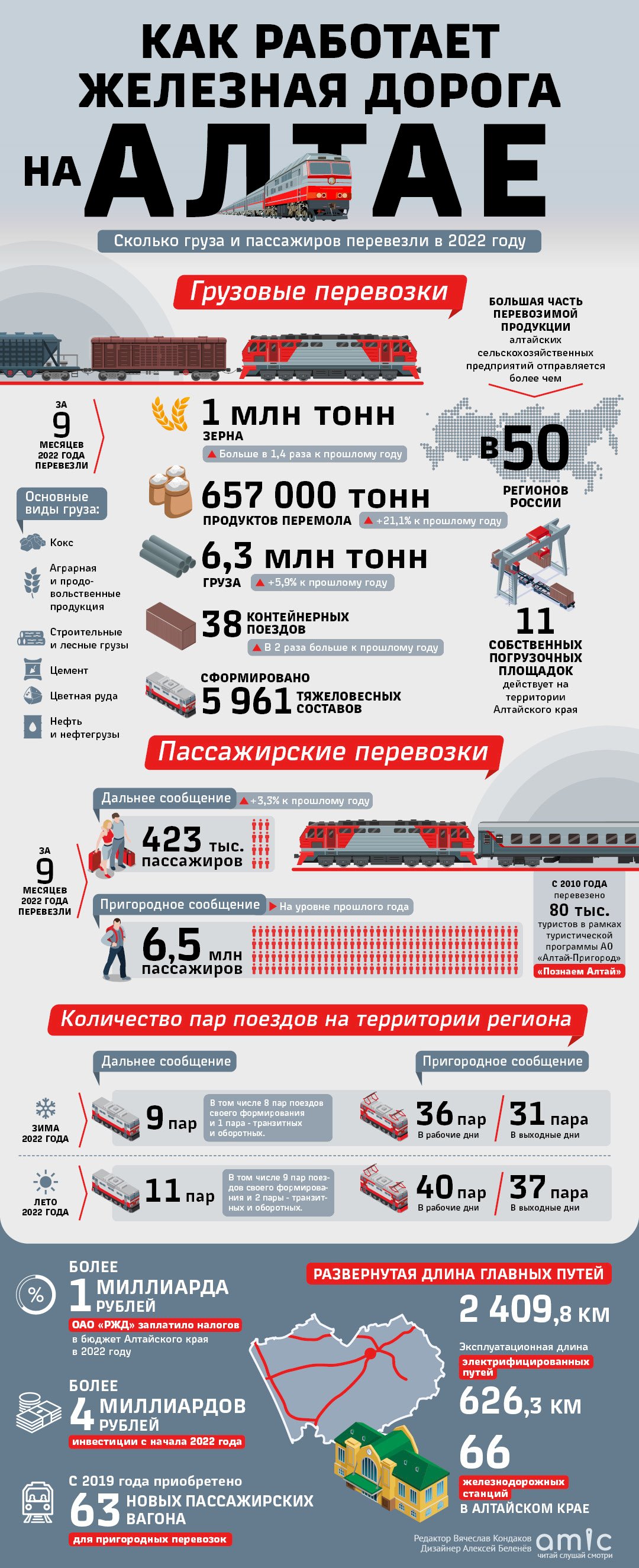 Фото: amic.ruЗа первые девять месяцев 2022 года ОАО «РЖД» в Алтайском крае перевезло несколько миллионов тонн груза: пшеницу, кокс, аграрную и продовольственную продукцию, строительные и лесные грузы, цемент, цветную руду, нефть и нефтегрузы. Большая часть товаров алтайских сельскохозяйственных предприятий отправляется свыше чем в 50 регионов России. Кроме того, с начала года поездами в регионе воспользовались несколько миллионов человек. О том, как работает железная дорога в Алтайском крае, смотрите в нашей инфографике.