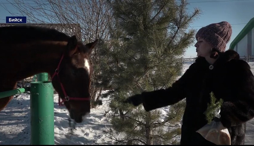 Конный клуб в Бийске подкармливает животных хвойными ветками