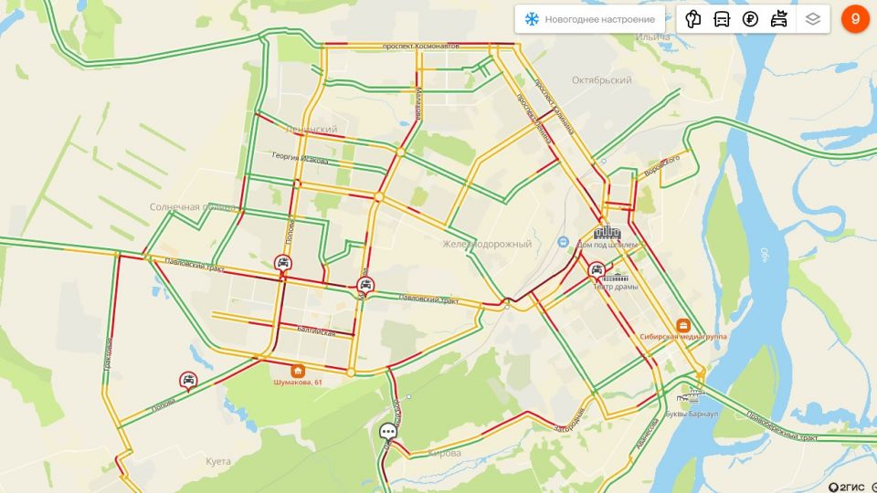 В Барнауле вечером 28 декабря сила дорожных пробок достигла максимума в 9 баллов. Данные об обстановке на улицах города передает сервис 2ГИС.