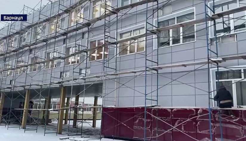 Школа №110 Барнаула. Фасад здания до сих пор в строительных лесах, хотя внутри учатся дети.