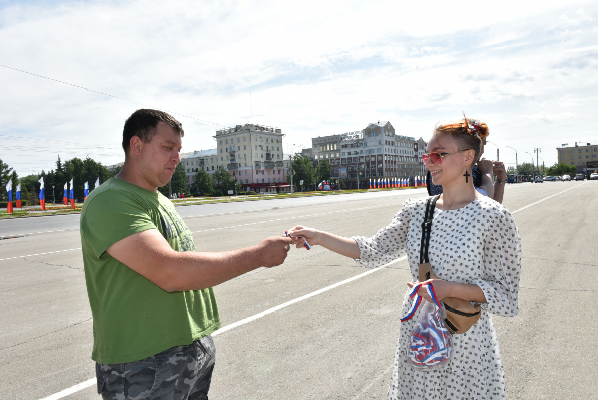 Жителям Барнаула вручают ленты в цветах российского флага в честь праздника
