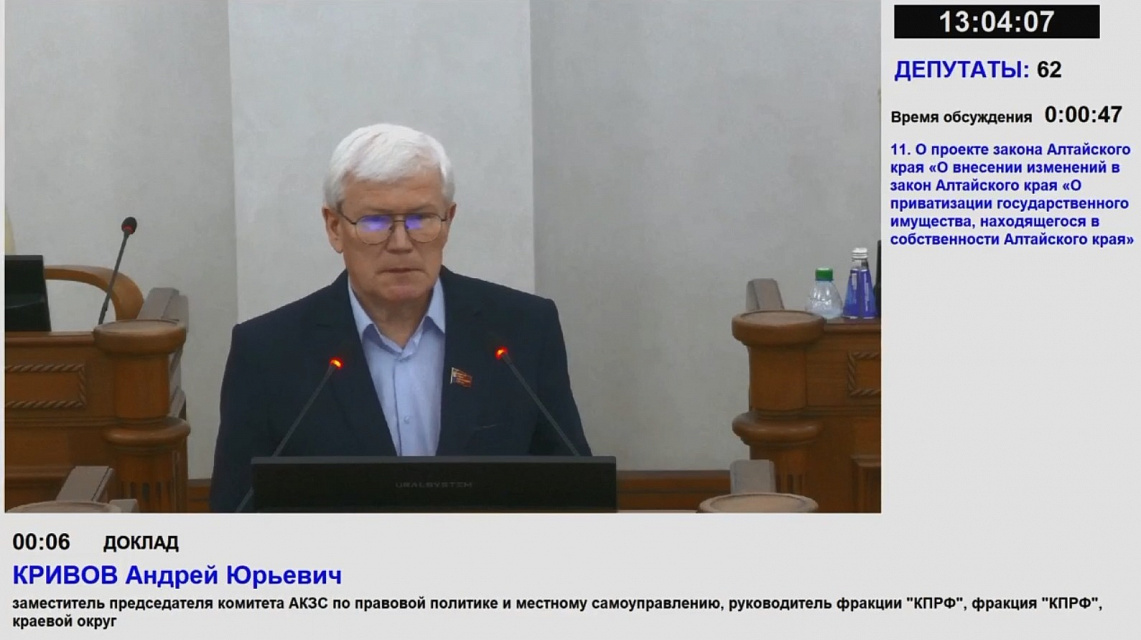 На очередной сессии Алтайского краевого Законодательного Собрания фракция КПРФ боролась за возвращение народным представителям права утверждения планов по приватизации госимущества и за сохранение выделяемых гражданам об