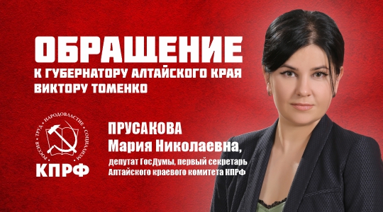 Первый секретарь Алтайского крайкома КПРФ, депутат Госдумы Мария Прусакова обратилась к главе Алтайского края Виктору Томенко.