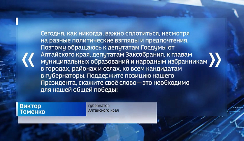 Алтай — с Путиным! И я уверен - все земляки поддерживают главу нашего государства. В условиях специальной военной операции, когда все наши силы нацелены на одну общую победу, разжигание конфликтов внутри страны — недопустимо. На краевом уровне мы обеспечиваем безопасность каждого жителя региона. Я провёл по этому поводу оперативное совещание с силовым блоком. Сегодня, как никогда, важно сплотиться, несмотря на разные политические взгляды и предпочтения. Поэтому обращаюсь к депутатам Госдумы от Алтайского края, депутатам Заксобрания, к главам муниципальных образований и народным избранникам в городах, районах и селах, ко всем кандидатам в губернаторы. Поддержите позицию нашего Президента, скажите своё слово — это необходимо для нашей общей победы!