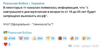 Фейк: В России с 21 сентября вводится запрет на выезд из страны для мужчин в возрасте от 18 до 65 лет. Информация активно распространяется в украинских телеграм-каналах.