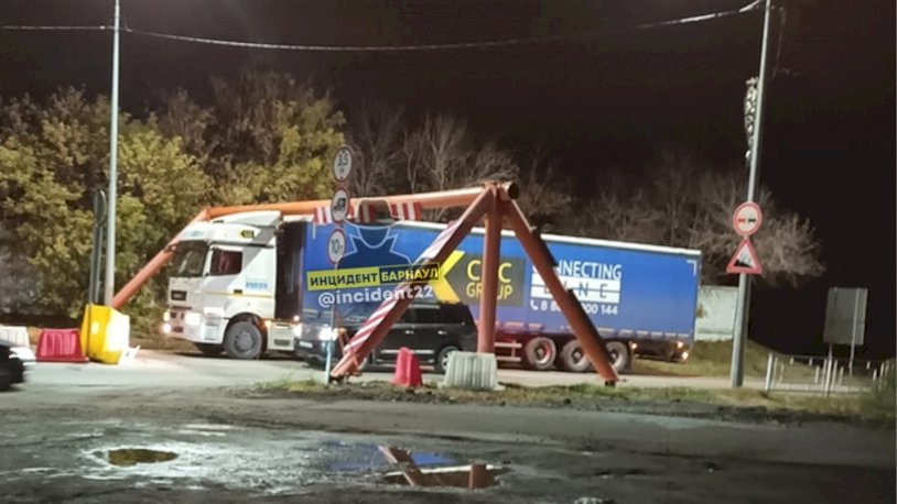 Происшествие случилось поздним вечером 28 сентября. На снимке можно заметить, как прицеп большегруза вплотную примкнул к металлической ограничительной рамке.