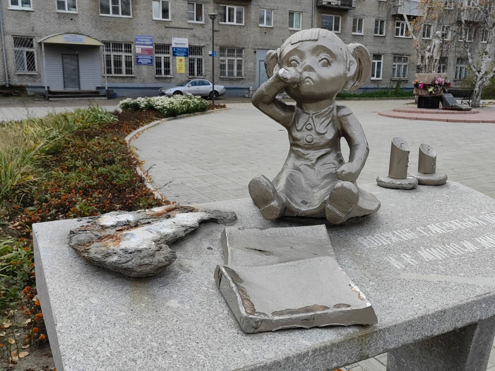 В Рубцовске произошло очередное грустное событие: вандалы повредили одну из скульптурных композиций, находящуюся в сквере «Непокоренные». Нелюди отломили фигуру плачущего игрушечного медведя, которая была установлена на парте. К счастью, злоумышленникам не удалось унести медведя, и они просто бросили его рядом с местом повреждения.