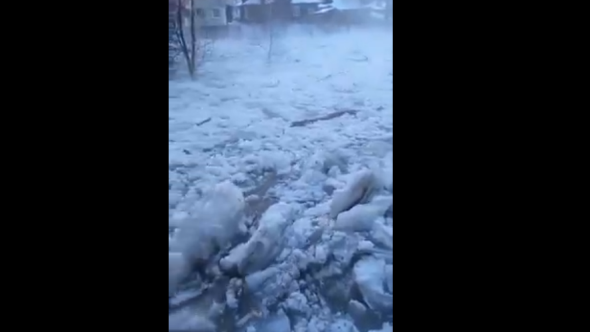 Бурный поток горной реки с большой скоростью пронес снег, лед и деревья и затопил некоторые прибрежные территории, доставив неудобства местным жителям