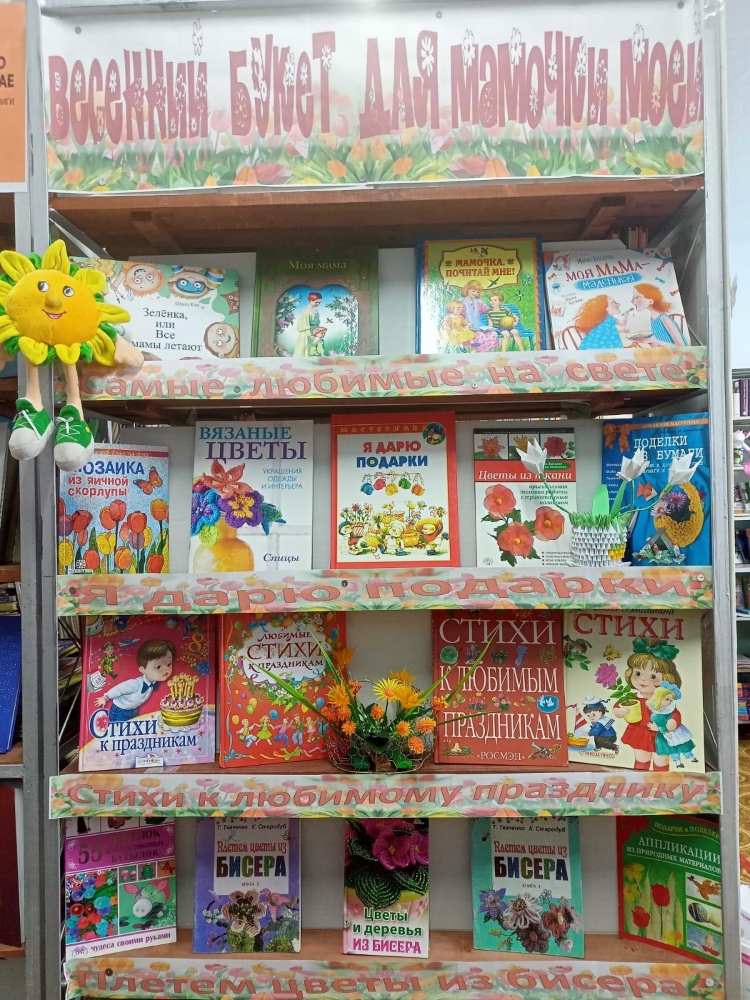 К Международному женскому дню в читальном зале Крутихинской районной детской библиотеке оформлена выставка – поздравление «Весенний букет для мамочки моей». Выставка состоит из 4-х разделов.