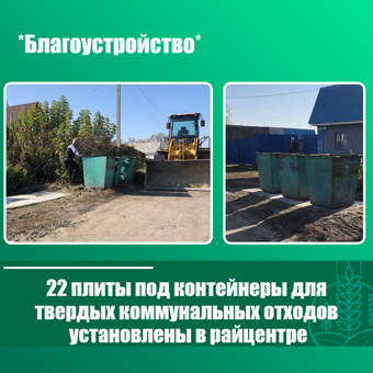 В райцентре закончен очередной этап работ по установке плит под контейнеры для ТКО. Всего установлено 22 плиты. Работы выполнены силами бригады ИП Некрасовой, средства выделены из районного бюджета.