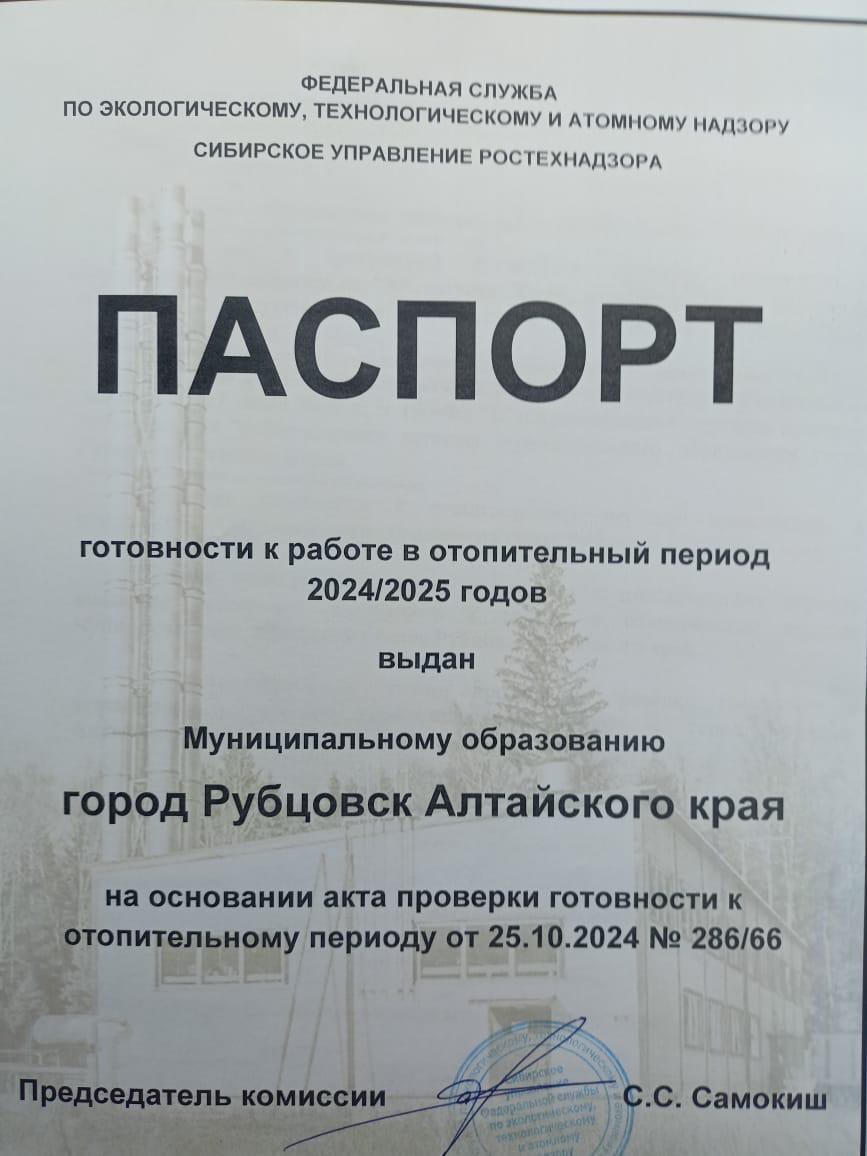 Рубцовск получил паспорт готовности к работе в отопительный период 2024/2025 годов. Этот документ был подписан председателем комиссии Сибирского управления Ростехнадзора.