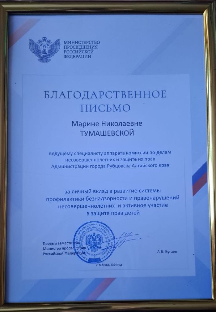 За годы своей работы в КДН она показала высокий уровень профессионализма и преданности делу, за что неоднократно была поощрена городскими и краевыми наградами. А 18 ноября на еженедельном аппаратном совещании первый заместитель Главы Администрации города Рубцовска - председатель комитета по финансам, налоговой и кредитной политике Владимир Пьянков вручил Марине Тумашевской Благодарственное письмо Министерства просвещения Российской Федерации за личный вклад в развитие системы профилактики безнадзорности и правонарушений несовершеннолетних и активное участие в защите прав детей. Награда по праву заслужена и имеет большое значение.