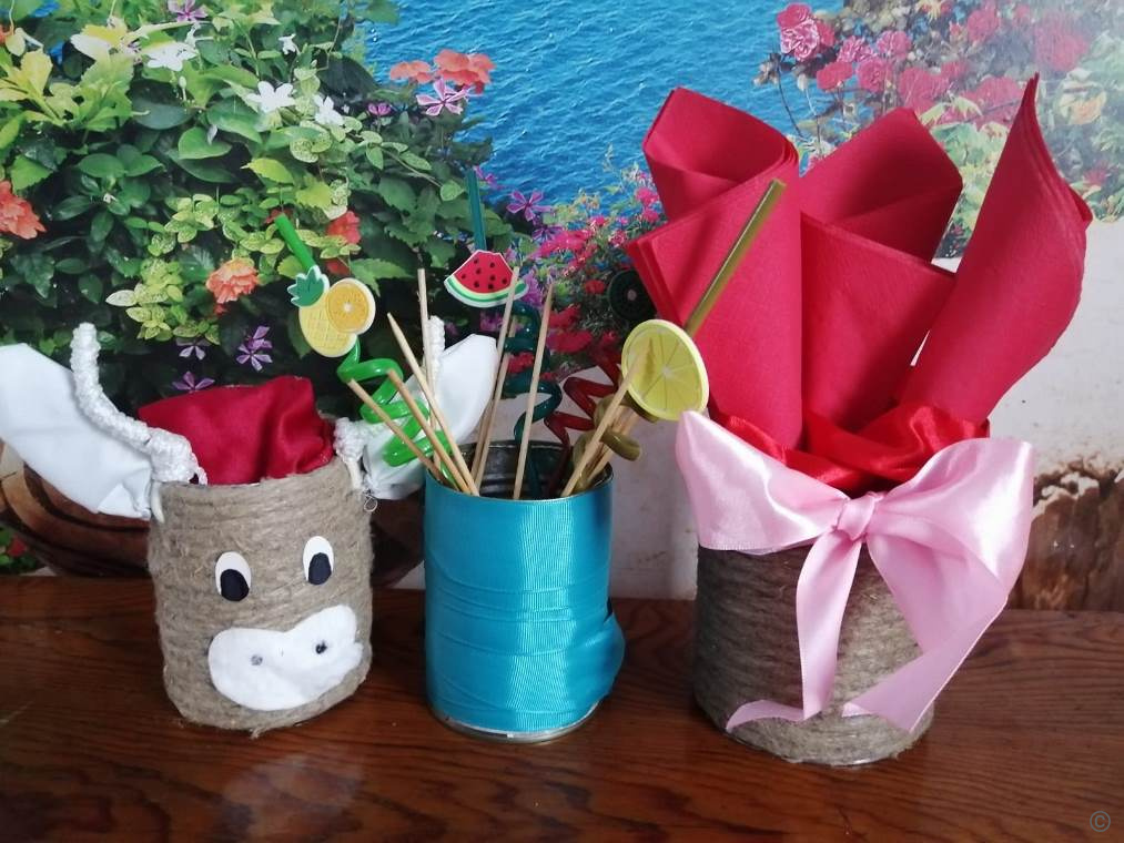 Юные жители п.Березовка под контролем взрослых учились декорировать вышедшие из обихода вещи: жестяные банки, картонные коробки и т.д. С помощью шпагата, ленточек, ножниц и других нехитрых приспособлений они изготовили оригинальные вазочки, подставки под лимонад, подстаканники, салфетницы и другие элементы декора.