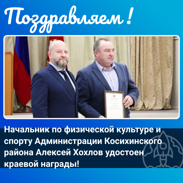 Распоряжением Губернатора Алтайского края за многолетний добросовестный труд и высокий профессионализм, Благодарностью Губернатора Алтайского края поощрен начальник по физической культуре и спорту Администрации Косихинского района Хохлов Алексей .