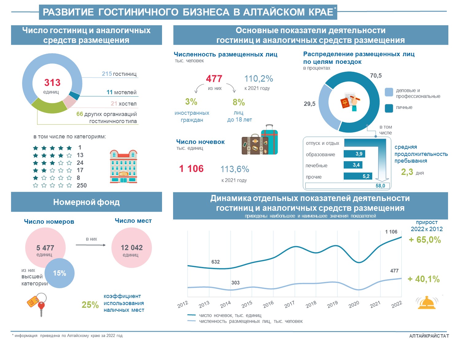 В гостиничный сектор края включаются гостиницы (отели, апарт-отели, сюит-отели), мотели, хостелы и другие организации гостиничного типа (меблированные комнаты, гостевые дома и др.). В 2022 году в Алтайском крае действовало 313 средств размещения гостиничного типа, наибольшую долю в них занимали гостиницы – 68,7%, мотели и хостелы – 10,2%, другие организации гостиничного типа – 21,1%.