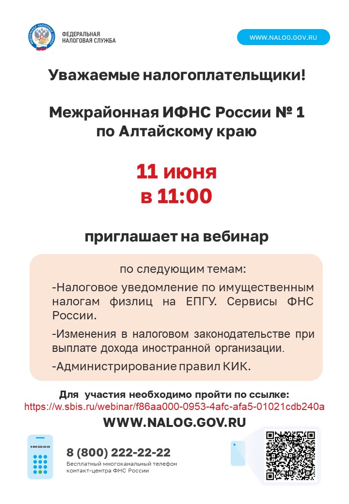 Межрайонная ИФНС России № 1 по Алтайскому краю приглашает налогоплательщиков принять участие в вебинаре по следующим темам: 1. Налоговое уведомление по имущественным налогам физлиц на ЕПГУ.Сервисы ФНС России.