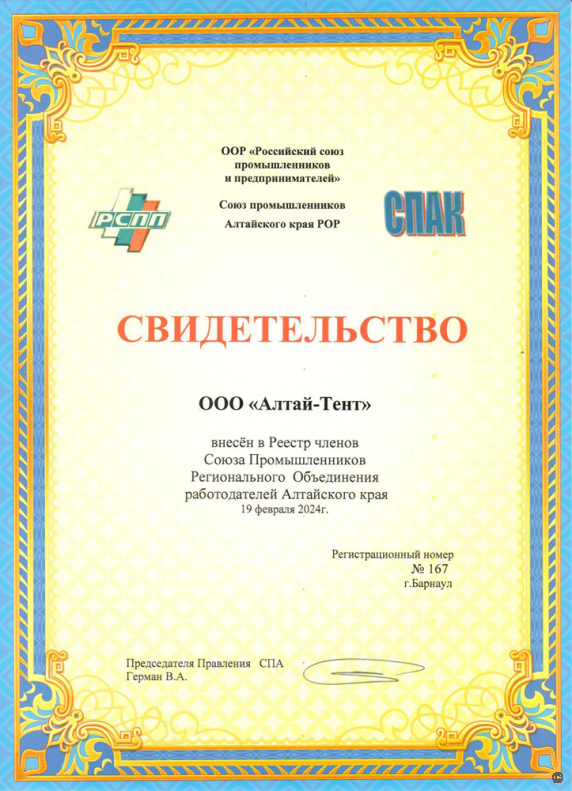 Накануне в состав Союза промышленников Алтайского края вошли предприятия ООО «Алтайтент», «Бродич».