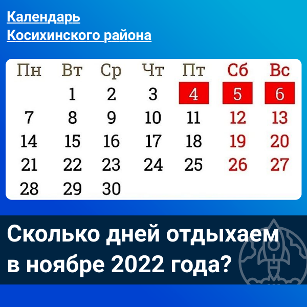 Итого: жители Косихинского района будут отдыхать с 4 ноября (пятница) по 6 ноября (воскресенье). На работу и учебу — в понедельник, 7-го.