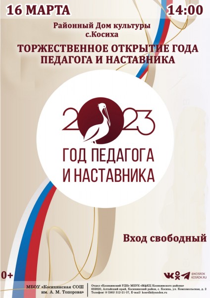 Завтра 16 марта в Косихинском районном Доме культуры состоится торжественное открытие Года педагога и наставника, объявленный президентом России,
